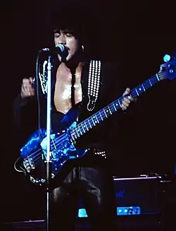 ![]() Thin Lizzy performing in 1983 (left to right): John Sykes, Phil Lynott, Scott Gorham and Darren Wharton. (Brian Downey not visible) | |