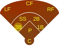 A third baseman, abbreviated 3B, is the player in baseball or softball whose responsibility is to defend the area nearest to third base — the third of four bases a baserunner must touch in succession to score a run. In the scoring system used to record defensive plays, the third baseman is assigned the number 5.
