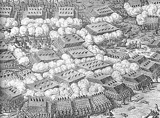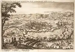The planned offensive fell apart when Turenne's mostly German troops mutinied, while Bavarian general Johann von Werth refused to comply with the truce.[125] Although the mutinies were quickly suppressed, Maximilian felt obliged to follow Werth's example, and in September ordered Bronckhorst-Gronsfeld to combine the remnants of the Bavarian army with Imperial troops under Peter von Holzappel.[126] Outnumbered by a Franco-Swedish army led by Wrangel and Turenne, they were defeated at Zusmarshausen in May 1648. Holzappel was killed, and although most of his army escaped thanks to Raimondo Montecuccoli, Bavaria was left defenceless once again.[127]