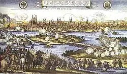 Gustavus put pressure on Brandenburg by sacking Küstrin and Frankfurt an der Oder and then bombarding George William in Berlin, while the Sack of Magdeburg in May 1631 provided a powerful warning of the consequences of imperial victory.[79] Once again, Richelieu used French financial power to bridge differences between the Swedes and their potential allies. In the 1631 Treaty of Bärwalde, he agreed to fund the Swedes and a number of small including Hesse-Kassel, Saxony, and Brandenburg.[80] These payments amounted to 400,000 Reichstaler per year, or one million livres, enabling Sweden to support a total of 36,000 troops.[81]