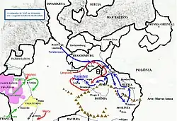 In April 1639, Banér defeated the Saxons at Chemnitz, then entered Bohemia in May.[97] To retrieve the situation, Ferdinand diverted Piccolomini's army from Thionville, ending direct military cooperation between Austria and Spain.[98] Pressure grew on Olivares to make peace, especially after French and Swedish gains in Germany cut the Spanish Road, forcing Madrid to resupply their armies in Flanders by sea. Attempts to re-assert maritime control ended when the Dutch fleet under Maarten Tromp won a significant victory over the Spanish at the Downs in October 1639.[99][100]