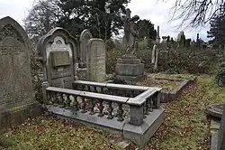 Following his retirement, Cook moved back to Leicester to a house, Thorncroft, he had had built on London Road.[3] His later years were marred by the death of his daughter in 1880 and of his wife in 1884 and by increasing loss of sight. He still managed to travel and went to the Holy Land in 1888. At home, he continued his work for the Baptist Church, the temperance movement, and other charities. He died following a stroke on 18 July 1892.[1] He was buried in Welford cemetery in Leicester.[9] His wealth at death was £2731 7s. 2d His son died in 1899, leaving an estate of £622,534 3s. 4d. The business of Thomas Cook & Son was then run by Cook's three grandsons.[1]