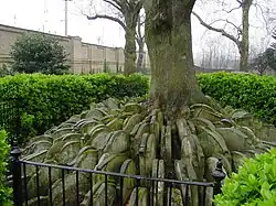 "The Hardy Tree", a Great Tree of London in Old St Pancras churchyard in London, growing between gravestones moved while Hardy was working there. The tree fell in December 2022.[4]