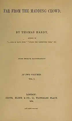 After he abandoned his first novel, Hardy wrote two new ones that he hoped would have more commercial appeal, Desperate Remedies (1871) and Under the Greenwood Tree (1872), both of which were published anonymously; it was while working on the latter that he met Emma Gifford, who would become his wife.[35] In 1873 A Pair of Blue Eyes, a novel drawing on Hardy's courtship of Emma, was published under his own name. A plot device popularised by Charles Dickens, the term "cliffhanger" is considered to have originated with the serialised version of A Pair of Blue Eyes (published in Tinsley's Magazine between September 1872 and July 1873) in which Henry Knight, one of the protagonists, is left literally hanging off a cliff.[37][38] Elements of Hardy's fiction reflect the influence of the commercially successful sensation fiction of the 1860s, particularly the legal complications in novels such as Desperate Remedies (1871), Far from the Madding Crowd (1874) and Two on a Tower (1882).[39]