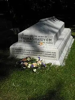 Shortly after helping to excavate the Fordington mosaic, Hardy became ill with pleurisy in December 1927 and died at Max Gate just after 9 pm on 11 January 1928, having dictated his final poem to his wife on his deathbed; the cause of death was cited, on his death certificate, as "cardiac syncope", with "old age" given as a contributory factor. His funeral was on 16 January at Westminster Abbey, and it proved a controversial occasion because Hardy had wished for his body to be interred at Stinsford church in the same grave as his first wife, Emma. His family and friends concurred; however, his executor, Sir Sydney Carlyle Cockerell, insisted that he be placed in the abbey's famous Poets' Corner. A compromise was reached whereby his heart was buried at Stinsford with Emma, and his ashes in Poets' Corner.[30] Hardy's estate at death was valued at £95,418 (equivalent to £7,300,000 in 2023).[31]
