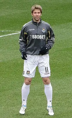 Hitzlsperger signed a three-year deal with Premier League club West Ham United in June 2010,[22] but due to an injury did not make his debut for the Hammers until an FA Cup fifth round match against Burnley on 21 February 2011, a game in which he scored in the 23rd minute of a 5–1 win with a "trademark thunderbolt" from 25 yards.[23] Hitzlsperger made his league debut for the East London club six days later in a 3–1 win against Liverpool at the Boleyn Ground.[24] He scored his first league goal for West Ham in the 3–0 home win against Stoke City on 5 March.[25] At the end of the season West Ham were relegated to the Football League Championship and Hitzlsperger's contract was terminated.[26]