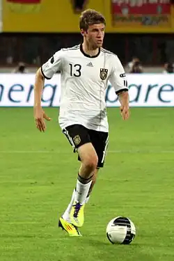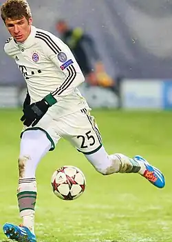 Thomas Müller (German pronunciation: [ˈtoːmas ˈmʏlɐ];[2] born 13 September 1989) is a German professional footballer who plays as a forward or attacking midfielder for Major League Soccer club Vancouver Whitecaps FC.[3][4][5] Widely regarded as one of the best players of his generation,[6][7][8] Müller has been praised for his positioning (hence his nickname "der Raumdeuter" (the 'interpreter of space')), finishing, work-rate, and consistency in both scoring and creating goals.[9] He is both the all-time German top goalscorer and assist provider in the UEFA Champions League, scoring 57 goals and providing 30 assists.[10][11]
