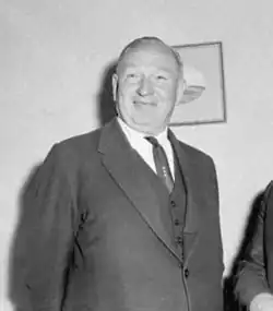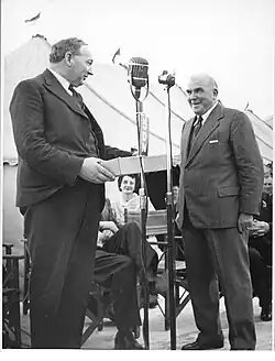 Many of the methods that Playford used were described by economic conservatives as 'socialism', drawing opposition from within his own party, especially in the Legislative Council.[91] It is even said that the Liberal leader in that chamber—Sir Collier Cudmore—once referred to Playford as a 'Bolshevik'.[92] The unique economic intervention earned Playford scorn from his own colleagues, but the Labor movement was much more receptive. Indeed, Labor leader Mick O'Halloran would dine with Playford on a weekly basis to discuss the development of the state, and the pair were on close personal terms.[93][94] At a dinner party, O'Halloran remarked that "I wouldn't want to be Premier even if I could be. Tom Playford can often do more for my own voters than I could if I were in his shoes."[94] O'Halloran's lack of ambition was mocked in a political cartoon, but the Labor leader took the piece as a compliment and had it framed and put on display.[95] As Playford had more opposition from his LCL colleagues in the upper house than Labor, O'Halloran was often described as the premier's 'junior partner".[93] Playford called Labor "our Opposition", in comparison to opponents in his party, which he decried as being "critical without being helpful".[93] This cooperative nature of party politics would not change until Don Dunstan's prominence in the late 1950s,[96] when Playford would be assailed not for his economics, but for his government's comparatively low expenditure on public services such as education and healthcare.[97][98]