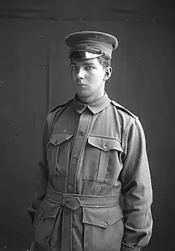 World War I broke out in 1914, and Playford wished to join the Australian Imperial Force. His parents persuaded him to assist them on the farm until close to his 19th birthday. He entered Keswick Barracks on 17 May 1915, was enlisted as a private and placed in the 27th Battalion, 2nd Division.[9] Playford was one of those who left Adelaide on HMAT Geelong on 31 May. The Geelong picked up more soldiers at Perth, and then sailed to Suez, Egypt.[10] The Australian soldiers received training in Egypt, but during the evenings left their camps to indulge themselves in the Egyptian towns and cities. Frequent fights broke out between the Australian troops and the locals, with responsible soldiers left to take the rest back to camp.[5] Playford assisted in this and dragged Australian soldiers from the beds of Egyptian prostitutes.[11] Training was completed after two months and Playford landed at Anzac Cove on 12 September 1915.[11]