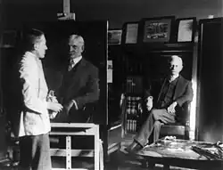 Marshall's humor caused him trouble during his time in Washington. He was known to greet citizens walking by his office on the White House tour by saying to them, "If you look on me as a wild animal, be kind enough to throw peanuts at me."[82] This prompted Wilson to move Marshall's office to the Senate Office building, where the Vice President would not be disturbed by visitors.[125] In response to Alexander Graham Bell's proposal to the board of the Smithsonian Institution to send a team to excavate for ruins in Guatemala, Marshall suggested that the team instead excavate around Washington. When asked why, he replied that, judging by the looks of the people walking on the street, they should be able to find buried cave-men no more than six feet down. The joke was not well received, and he was shut out of board meetings for nearly a year.[67]
