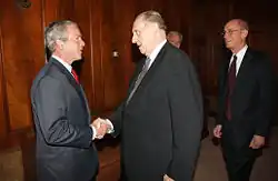Monson and his counselors met with President George W. Bush on May 29, 2008, during Bush's visit to Salt Lake City.[58] He and apostle Dallin H. Oaks met with President Barack Obama and Senator Harry Reid in the Oval Office on July 20, 2009, and presented Obama with five volumes of his personal family history records.[59] Monson did not attend a meeting other church leaders, including Eyring and Uchtdorf, had with Obama during his visit to Utah in April 2015. A church spokesperson indicated the absence was in order to save Monson's strength for the church's general conference the following weekend.[60] As 2015 progressed, Monson gave the closing talk at the funerals of L. Tom Perry, Boyd K. Packer, and Richard G. Scott.[61]