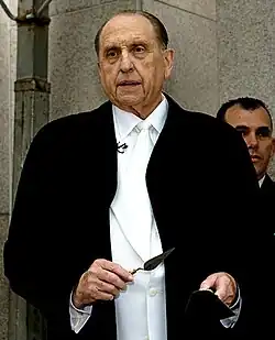 Monson was ordained an LDS apostle at age 36, served in the First Presidency under three church presidents, and was the President of the Quorum of the Twelve Apostles from March 12, 1995, until he became President of the Church on February 3, 2008.[1] He succeeded Gordon B. Hinckley as church president.[2][3]