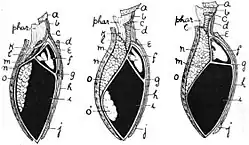 The existence of a membrane separating the pharynx from the stomach can be traced widely among the chordates. Thus the model organism, the marine chordate lancelet, possesses an atriopore by which water exits the pharynx, which has been claimed (and disputed) to be homologous to structures in ascidians and hagfishes.[24] The tunicate epicardium separates digestive organs from the pharynx and heart, but the anus returns to the upper compartment to discharge wastes through an outgoing siphon.