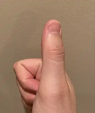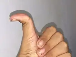 There is a variation of the human thumb where the angle between the first and second (proximal and distal) phalanges varies between 0° and almost 90° when the thumb is in a thumbs-up gesture.[31]