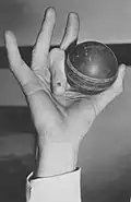 Right: Cricketer Jack Iverson's "bent finger grip", an unusual pad-to-side precision grip designed to confuse batsmen.