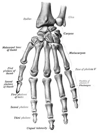 ![]() Bones of the thumb, visible at far left | |