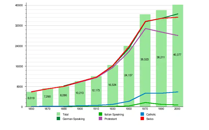 | Year | Total Population | German Speaking | Italian Speaking | Protestant | Catholic | Other | Jewish | Muslim | No religion given | Swiss | Non-Swiss |