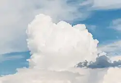 Warm air has a lower density than cool air, so warmer air rises upwards and cooler air will settle at the bottom.[8] Clouds form when relatively warmer air, carrying moisture, rises within cooler air. The moist air rises, and, as it does so, it cools and some of the water vapor in that rising air condenses.[9] When the moisture condenses, it releases energy known as latent heat of condensation, which allows the rising packet of air to cool less than the cooler surrounding air[10] continuing the cloud's ascension. If enough instability is present in the atmosphere, this process will continue long enough for cumulonimbus clouds to form and produce lightning and thunder. Meteorological indices such as convective available potential energy (CAPE) and the lifted index can be used to assist in determining potential upward vertical development of clouds.[11] Generally, thunderstorms require moisture, an unstable air mass, and a lifting force in order to form.
