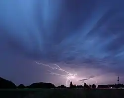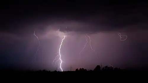 A thunderstorm, also known as an electrical storm or a lightning storm, is a storm characterized by the presence of lightning and thunder.[1] Relatively weak thunderstorms are sometimes called thundershowers.[2] Thunderstorms occur in cumulonimbus clouds.[3] They are usually accompanied by strong winds[4] and often produce heavy rain[4] and sometimes snow, sleet, or hail,[4] but some thunderstorms can produce little or no precipitation at all. Thunderstorms may line up in a series or become a rainband, known as a squall line. Strong or severe thunderstorms include some of the most dangerous weather phenomena, including large hail, strong winds, and tornadoes. Some of the most persistent severe thunderstorms, known as supercells, rotate as do cyclones. While most thunderstorms move with the mean wind flow through the layer of the troposphere that they occupy, vertical wind shear sometimes causes a deviation in their course at a right angle to the wind shear direction.