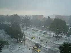 In North America, hail is most common in the area where Colorado, Nebraska, and Wyoming meet, known as "Hail Alley".[70] Hail in this region occurs between the months of March and October during the afternoon and evening hours, with the bulk of the occurrences from May through September. Cheyenne, Wyoming, is North America's most hail-prone city with an average of nine to ten hailstorms per season.[62] In South America, areas prone to hail are cities like Bogotá, Colombia.