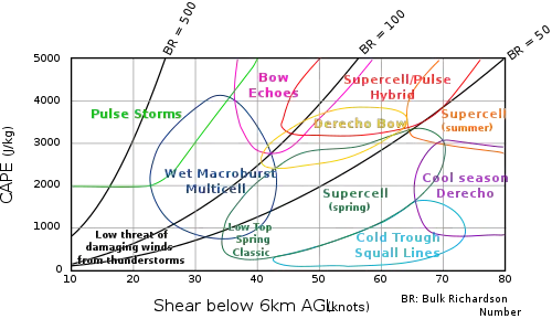 Organized thunderstorms and thunderstorm clusters/lines can have longer life cycles as they form in environments of significant vertical wind shear, normally greater than 25 knots (13 m/s) in the lowest 6 kilometres (3.7 mi) of the troposphere,[20] which aids the development of stronger updrafts as well as various forms of severe weather. The supercell is the strongest of the thunderstorms,[7] most commonly associated with large hail, high winds, and tornado formation. Precipitable water values of greater than 31.8 millimetres (1.25 in) favor the development of organized thunderstorm complexes.[21] Those with heavy rainfall normally have precipitable water values greater than 36.9 millimetres (1.45 in).[22] Upstream values of CAPE of greater than 800 J/kg are usually required for the development of organized convection.[23]