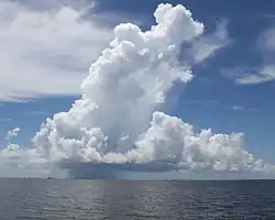 Thunderstorms result from the rapid upward movement of warm, moist air, sometimes along a front.[5] However, some kind of cloud forcing, whether it is a front, shortwave trough, or another system is needed for the air to rapidly accelerate upward. As the warm, moist air moves upward, it cools, condenses,[5] and forms a cumulonimbus cloud that can reach heights of over 20 kilometres (12 mi). As the rising air reaches its dew point temperature, water vapor condenses into water droplets or ice, reducing pressure locally within the thunderstorm cell. Any precipitation falls the long distance through the clouds towards the Earth's surface. As the droplets fall, they collide with other droplets and become larger. The falling droplets create a downdraft as it pulls cold air with it, and this cold air spreads out at the Earth's surface, occasionally causing strong winds that are commonly associated with thunderstorms.
