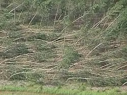 Trees uprooted or displaced by the force of a downburst wind in northwest Monroe County, Wisconsin