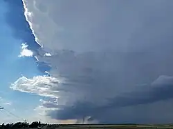 Supercell storms are large, usually severe, quasi-steady-state storms that form in an environment where wind speed or wind direction varies with height ("wind shear"), and they have separate downdrafts and updrafts (i.e., where its associated precipitation is not falling through the updraft) with a strong, rotating updraft (a "mesocyclone"). These storms normally have such powerful updrafts that the top of the supercell storm cloud (or anvil) can break through the troposphere and reach into the lower levels of the stratosphere. Supercell storms can be 24 kilometres (15 mi) wide. Research has shown that at least 90 percent of supercells cause severe weather.[17] These storms can produce destructive tornadoes, extremely large hailstones (10 centimetres or 4 inches diameter), straight-line winds in excess of 130 km/h (81 mph), and flash floods. In fact, research has shown that most tornadoes occur from this type of thunderstorm.[33] Supercells are generally the strongest type of thunderstorm.[14]