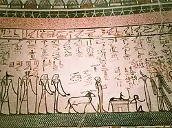The wall decorations are executed in a simple "diagrammatic" way, imitating the manner of the cursive script of a funerary papyrus rather than the more lavish wall decorations typical of most other royal tombs. The colouring is similarly muted, executed in simple black figures accompanied by text on a cream background with highlights in red and pink. The decorations depict the pharaoh aiding the deities in defeating Apep, the serpent of chaos, thereby helping to ensure the daily rebirth of the sun as well as the pharaoh's own resurrection.[85]