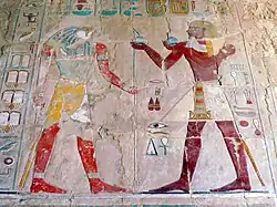 Sokaris receiving gifts from Thutmosis III in Anubis temple, Hatshepsut temple, Deir el-Bahari, Theban Necropolis, Egypt
