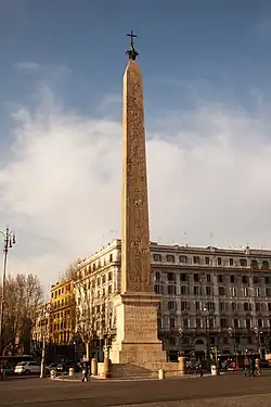 East of the Iput-Isut, he erected another temple to Aten, where he was depicted as being supported by Amun.[75] It was inside this temple that Thutmose planned on erecting his tekhen waty, or "unique obelisk."[75] The tekhen waty was designed to stand alone instead as part of a pair and is the tallest obelisk ever successfully cut. It was not, however, erected until Thutmose IV raised it[75] 35 years later.[76] It was later moved to Rome by Emperor Constantius II and is now known as the Lateran Obelisk.