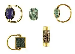 Beads and scarab finger rings of Thutmose III in the Metropolitan Museum of Art.