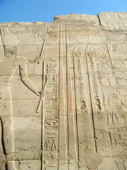 The ensuing Battle of Megiddo was likely the largest battle of Thutmose's 17 campaigns. A ridge of mountains jutting inland from Mount Carmel stood between Thutmose and Megiddo and he had three attack routes to choose from.[33] The northern and southern routes around the mountain were judged by his generals to be safest, but Thutmose (as he boasted in an inscription) called them cowards and took the dangerous route through the Aruna mountain pass,[34] which he said was only wide enough for single-file "horse after horse and man after man."[32] Such a pass does exist, although it is not as narrow as Thutmose claims.[35] The army emerged on the plain of Esdraelon, brilliantly cutting between the rear of the Canaanite forces and Megiddo city.[33] According to Thutmose III's Hall of Annals in the Temple of Amun at Karnak, the battle occurred on "Year 23, I Shemu [day] 21, the exact day of the feast of the new moon",[36] a lunar date. This date corresponds to 9 May 1457 BC, based on Thutmose III's accession in 1479 BC. In the battle, Thutmose routed the Canaanite forces,[34][33] but allowed many to escape into Megiddo while his troops stopped to plunder.[37] Thutmose was forced to besiege the city, and finally took it after a siege of seven or eight months.[37]