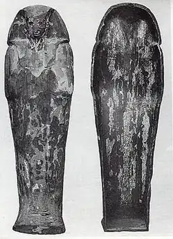 Unlike many other examples from the Deir el-Bahri Cache, the wooden mummiform coffin that contained the body was original to the pharaoh, though any gilding or decoration it might have had had been hacked off in antiquity.