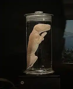 A draft whole genome sequencing of the thylacine was produced by Feigin et al. (2017) using the DNA extracted from an ethanol-preserved pouch of a young specimen provided by Museums Victoria. The neonatal development of the thylacine was also reconstructed from preserved pouch young specimens from several museum collections.[151] Researchers used the genome to study aspects of the thylacine's evolution and natural history, including the genetic basis of its convergence with canids, clarifying its evolutionary relationships with other marsupials and examining changes in its population size over time.[152]