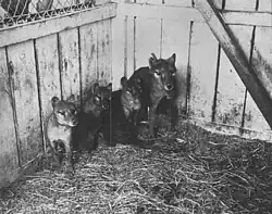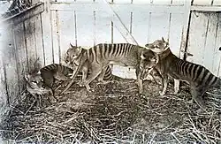 | A female thylacine and her juvenile offspring in the National Zoo in Washington, D.C., c. 1903[1] | |