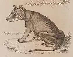 The first detailed scientific description was made by Tasmania's Deputy Surveyor-General, George Harris, in 1808, five years after first European settlement of the island.[3][19][20] Harris originally placed the thylacine in the genus Didelphis, which had been created by Linnaeus for the American opossums, describing it as Didelphis cynocephala, the "dog-headed opossum". Recognition that the Australian marsupials were fundamentally different from the known mammal genera led to the establishment of the modern classification scheme, and in 1796, Geoffroy Saint-Hilaire created the genus Dasyurus, where he placed the thylacine in 1810. To maintain gender agreement with the genus name, the species name was altered to cynocephalus. In 1824, it was separated out into its own genus, Thylacinus, by Temminck.[21] The common name derives directly from the genus name, originally from the Greek θύλακος (thýlakos), meaning "pouch" or "sack" and ine meaning "pertaining to".[22] The name is pronounced THY-lə-seen[23] or THY-lə-syne.[24]