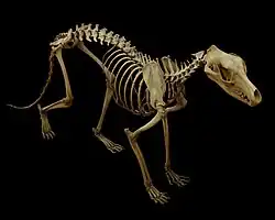 Thylacines, uniquely for marsupials, had largely cartilaginous epipubic bones with a highly reduced osseous element.[38][39] This was once considered a synapomorphy with sparassodonts,[40] though it is now thought that both groups reduced their epipubics independently. Its yellow-brown coat featured 15 to 20 distinctive dark stripes across its back, rump and the base of its tail,[41] which earned the animal the nickname "tiger". The stripes were more pronounced in younger specimens, fading as the animal got older.[41] One of the stripes extended down the outside of the rear thigh. Its body hair was dense and soft, up to 15 mm (0.59 in) in length. Colouration varied from light fawn to a dark brown; the belly was cream-coloured.[42]