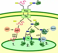 - ^ a b Gutensohn M, Fan E, Frielingsdorf S, et al. (2006). "Toc, Tic, Tat et al.: structure and function of protein transport machineries in chloroplasts". J. Plant Physiol. 163 (3): 333–47. Bibcode:2006JPPhy.163..333G. doi:10.1016/j.jplph.2005.11.009. PMID 16386331.