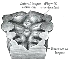 In the development of the embryo, at 3–4 weeks gestational age, the thyroid gland appears as an epithelial proliferation in the floor of the pharynx at the base of the tongue between the tuberculum impar and the copula linguae. The copula soon becomes covered over by the hypopharyngeal eminence[18] at a point later indicated by the foramen cecum. The thyroid then descends in front of the pharyngeal gut as a bilobed diverticulum through the thyroglossal duct. Over the next few weeks, it migrates to the base of the neck, passing in front of the hyoid bone. During migration, the thyroid remains connected to the tongue by a narrow canal, the thyroglossal duct. At the end of the fifth week the thyroglossal duct degenerates, and over the following two weeks the detached thyroid migrates to its final position.[18]