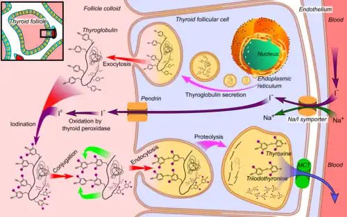 Iodine is essential for the production of the thyroid hormones. Iodine (I0) travels in the blood as iodide (I−), which is taken up into the follicular cells by a sodium-iodide symporter. This is an ion channel on the cell membrane which in the same action transports two sodium ions and an iodide ion into the cell.[35] Iodide then travels from within the cell into the lumen, through the action of pendrin, an iodide-chloride antiporter. In the follicular lumen, the iodide is then oxidized to iodine. This makes it more reactive,[33] and the iodine is attached to the active tyrosine units in thyroglobulin by the enzyme thyroid peroxidase. This forms the precursors of thyroid hormones monoiodotyrosine (MIT), and diiodotyrosine (DIT).[2]