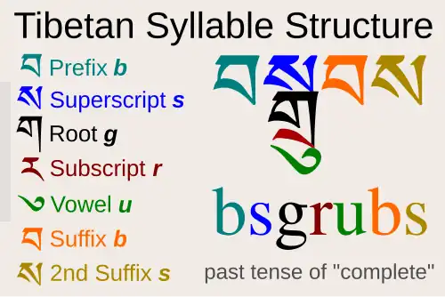 One aspect of the Tibetan script is that the consonants can be written either as radicals or they can be written in other forms, such as subscript and superscript forming consonant clusters.