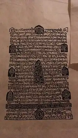 Little is known about the exact origins of Tibetan script.[7] According to Tibetan historiography, it was developed during the reign of King Songtsen Gampo by his minister Thonmi Sambhota, who was sent to India along with other scholars to study Buddhism along with Sanskrit and other brahmi languages.[8][9] They developed the Tibetan script from the Gupta script[10] while at the Pabonka Hermitage.