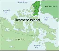 In 2004, three fossilized Tiktaalik skeletons were discovered in the Late Devonian fluvial Fram Formation on Ellesmere Island, Nunavut, in northern Canada.[5][6] Estimated ages were reported at 375 Ma, 379 Ma and 383 Ma. At the time of the species' existence, Ellesmere Island was part of the continent Laurentia (modern eastern North America and Greenland),[7] which was centered on the equator and had a warm climate. When discovered, one of the skulls was found sticking out of a cliff. Upon further inspection, the fossil was found to be in excellent condition for a 375-million-year-old specimen.[8][9]