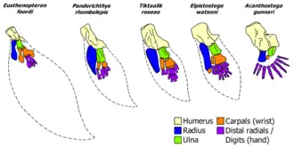 - ^ a b c Stewart, Thomas A.; Lemberg, Justin B.; Taft, Natalia K.; Yoo, Ihna; Daeschler, Edward B.; Shubin, Neil H. (2019). "Fin ray patterns at the fin-to-limb transition". Proceedings of the National Academy of Sciences. 117 (3): 1612–1620. doi:10.1073/pnas.1915983117. PMC 6983361. PMID 31888998.