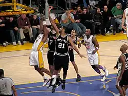On July 16, 2003, Duncan signed a seven-year, $122 million contract with the Spurs.[61] Before the 2003–04 season began, the Spurs lost their perennial captain David Robinson to retirement. Embracing the lone team leader role, Duncan led a reformed Spurs team which included Slovenian center Rasho Nesterović, defensive stalwart Bruce Bowen, Argentinian shooting guard Manu Ginóbili and young French point guard Tony Parker. Coming off the bench were clutch shooting power forward Robert Horry, versatile Hedo Türkoğlu and veterans Malik Rose and Kevin Willis.[62] In retrospect, Robinson commented that at first, Duncan was reluctant to step into the void, still needing some time to truly develop his leadership skills.[63] Statistically though, Duncan remained strong; after another convincing season with averages of 22.3 points, 12.4 rebounds, 3.1 assists and 2.7 blocks,[7] he led the Spurs into the Western Conference Semifinals. There, they met the Los Angeles Lakers again, split the series 2–2, and in Game 5, Duncan made a toughly defended jump shot which put the Spurs ahead by one point with 0.4 seconds left to play. Despite the little time remaining, Lakers point guard Derek Fisher hit a buzzer beater, giving his team the win.[64][65] In the end, the Spurs lost the series 4–2, and Duncan attributed the strong Lakers defense as one of the reasons for the loss.[66]