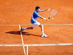 At Henman's first clay tournament of 2005, the Monte-Carlo Masters, he lost in the first round to Argentinian Mariano Zabaleta, 4–6, 6–4, 2–6. Henman improved his clay record that year by reaching the third round at both the Italian Open and the Hamburg Masters, but he disappointed his fans by being defeated by Peruvian Luis Horna in the second round of the French Open in four sets, 5–7, 7–6, 3–6, 4–6. In contrast to the clay season, the grass season began well, with Henman reaching the quarter-finals at the Queen's Club Championships, losing to Swedish Thomas Johansson, 4–6, 4–6. However, after defeating Jarkko Nieminen in the first round of the Wimbledon Championship, he lost in the second round to Russian Dmitry Tursunov in five sets, 6–3, 2–6, 6–3, 3–6, 6–8. His hard court season was not much better; Henman was defeated in the first or second round in all the remaining tournaments he participated in that year. At the US Open he lost to Spaniard Fernando Verdasco in straight sets, 4–6, 2–6, 2–6. At his last match of the year, Henman was beaten by Britain's rising tennis star Andy Murray in the first round in three sets, 3–6, 7–5, 7–6.[47]