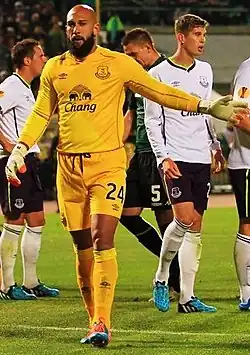 In March 2012, Howard agreed a new contract to keep him at the club until the summer of 2016.[40] On March 2, 2013, Howard's run of 210 consecutive Premier League appearances dating back to September 2007 came to an end as he missed a game against Reading with a finger injury.[41] He was two games short of equalling Neville Southall's club record.[42] In May, Howard kept his 100th clean sheet for Everton in a 0–0 draw against Liverpool in the Merseyside derby.[43][44]