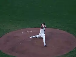 Lincecum threw a four-seam fastball, but mostly used a two-seam fastball which he threw for more sinking movement to get more ground balls. This pitch had little lateral movement due to his overhand delivery and the speed at which the pitch was thrown. He had a curveball which broke away from right-handed hitters.[148] These were his primary pitches when he first reached the major leagues, but as his career progressed, he added two more.[149] In 2007, he added a changeup with a grip similar to that of a split-finger fastball.[148][149] A fast pitch, his changeup appeared similar to his fastball for the first 30 feet (9.1 m), but then dove down sharply and tailed away from left-handed batters.[148][150][149] The changeup was his favorite pitch to throw with two strikes.[149] He had thrown a slider in college, and he started using it again in 2008, throwing it far more often by 2011.[150][149] The slider was a pitch he used when ahead in the count, as he preferred to rely on his fastball when he was behind.[149] He reached 99 mph (159 km/h) with his fastball in rookie year.[151] The fastball averaged 94.1 miles per hour (151.4 km/h) in 2008 and 92.4 miles per hour (148.7 km/h) in 2009, but by 2014 it was averaging less than 90 miles per hour (140 km/h).[148][86][152] His other pitches were typically in the high-70/low-80 mph range (approximately 128.75 km/h); these also slowed slightly as his career progressed.[148]