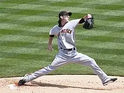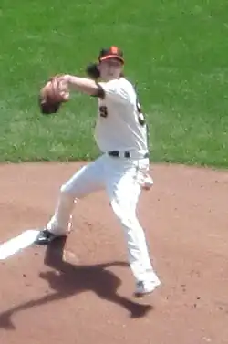 Timothy Leroy Lincecum (/ˈlɪnsəkʌm/ LIN-sə-kum;[1] born June 15, 1984), nicknamed "the Freak",[2] is an American former professional baseball pitcher who played ten seasons in Major League Baseball (MLB), primarily for the San Francisco Giants. A two-time Cy Young Award winner, Lincecum won World Series championships in 2010, 2012, and 2014 as a member of the Giants.